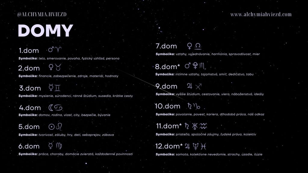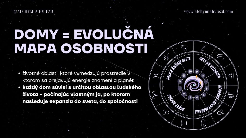 Domy teda vytvárajú štruktúru životného príbehu človeka – od prvého domu, ktorý symbolizuje naše „ja“ a spôsob, akým vstupujeme do sveta, až po dvanásty dom, ktorý ukazuje naše skryté vrstvy, nevedomie a duchovné zjednotenie s celkom.