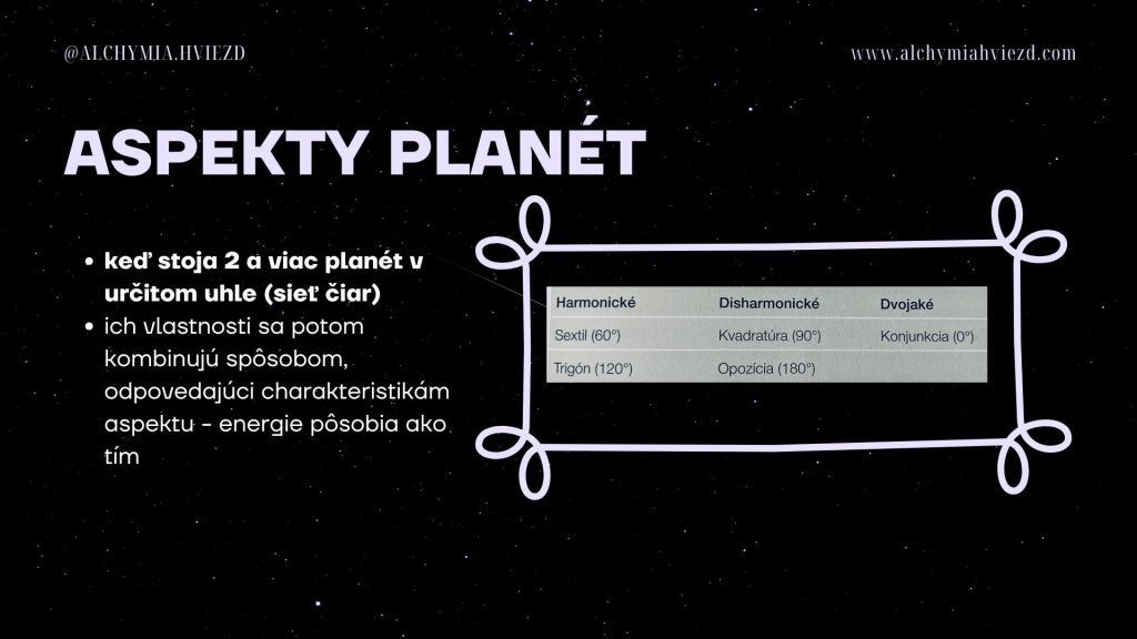 Aspekty sú uhlové vzdialenosti medzi planétami, ktoré ukazujú, ako medzi sebou jednotlivé vnútorné princípy komunikujú. Harmonické aspekty (trigóny, sextily) symbolizujú prirodzený súlad a plynutie energie, kým disharmonické (kvadratúry, opozície) odhaľujú vnútorné napätia a výzvy. Konjukcie predstavujú neutrálne energie, kde 2 planéty tvoria 1 celok. Aspekty sú vlákna prepojení – hovoria o tom, ako sa naše vnútorné časti navzájom ovplyvňujú, spolupracujú či potrebujú integrovať.