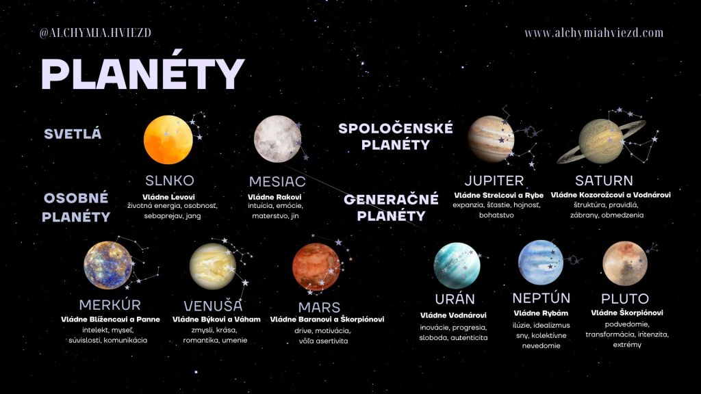 Planéty predstavujú vnútorné princípy a časti našej psychiky. Každá z nich symbolizuje určitú silu, potrebu či archetyp, ktorý sa v nás prejavuje. Slnko hovorí o našej životnej energii a tvorivosti, Mesiac o emóciách a potrebách duše, Merkúr o myslení, Venuša o láske a hodnote, Mars o vôli a konaní. Planéty sú teda aktéri v našom vnútornom príbehu – každý z nich má svoj hlas a potrebuje byť prijatý, pochopený a žitý.