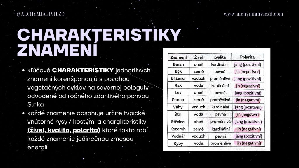 Ich charakteristiky odrážajú prírodné cykly severnej pologule – rytmy svetla a tmy, obdobia klíčenia, rastu, dozrievania a ústupu do ticha. Preto napríklad Baran nesie energiu jarného prielomu a nového začiatku, Býk energiu ukotvenia a hmotného rozkvetu, Blíženci pohyb a výmenu informácií, Rak ochranu a citovú pamäť. Znamenia sú usporiadané v poradí, ktoré odráža evolučný príbeh duše – cestu od prvotného impulzu k plnej zrelosti a duchovnému poznaniu.